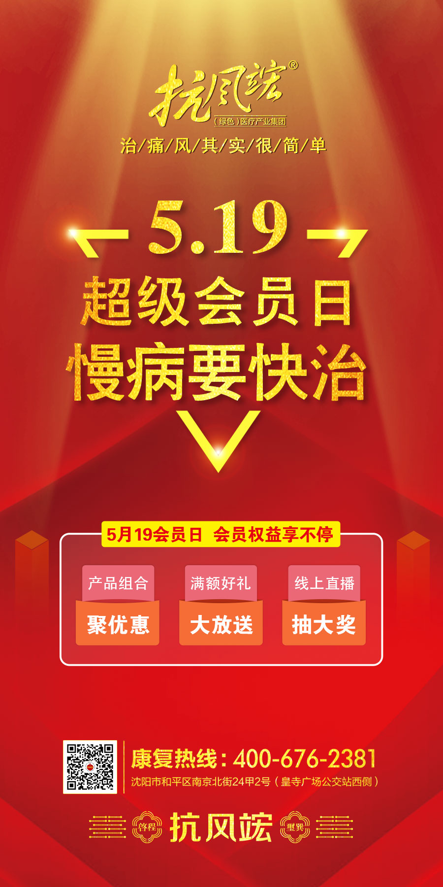 抗風(fēng)竤(綠色)醫(yī)療產(chǎn)業(yè)管理集團(tuán),正式啟動(dòng)“超級(jí)會(huì)員日”為十二年來(lái)跟隨抗風(fēng)竤一路走來(lái)的9萬(wàn)余名痛風(fēng)患者以及深受痛風(fēng)困擾的8000萬(wàn)患者創(chuàng)造了一個(gè)屬于自己的康復(fù)節(jié)日,即每月19日定為抗風(fēng)竤“超級(jí)會(huì)員日”。