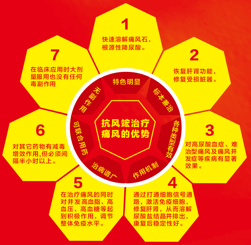 抗風(fēng)竤之所以受到市場如此多的關(guān)注,正是因?yàn)榭癸L(fēng)竤的產(chǎn)品優(yōu)越于藥物,綠色、安全、尊重自然,彌補(bǔ)了痛風(fēng)治療領(lǐng)域中,藥物和手術(shù)的不足,不用手術(shù)取石,避免患者受到二次傷害,其中包含以下優(yōu)勢: